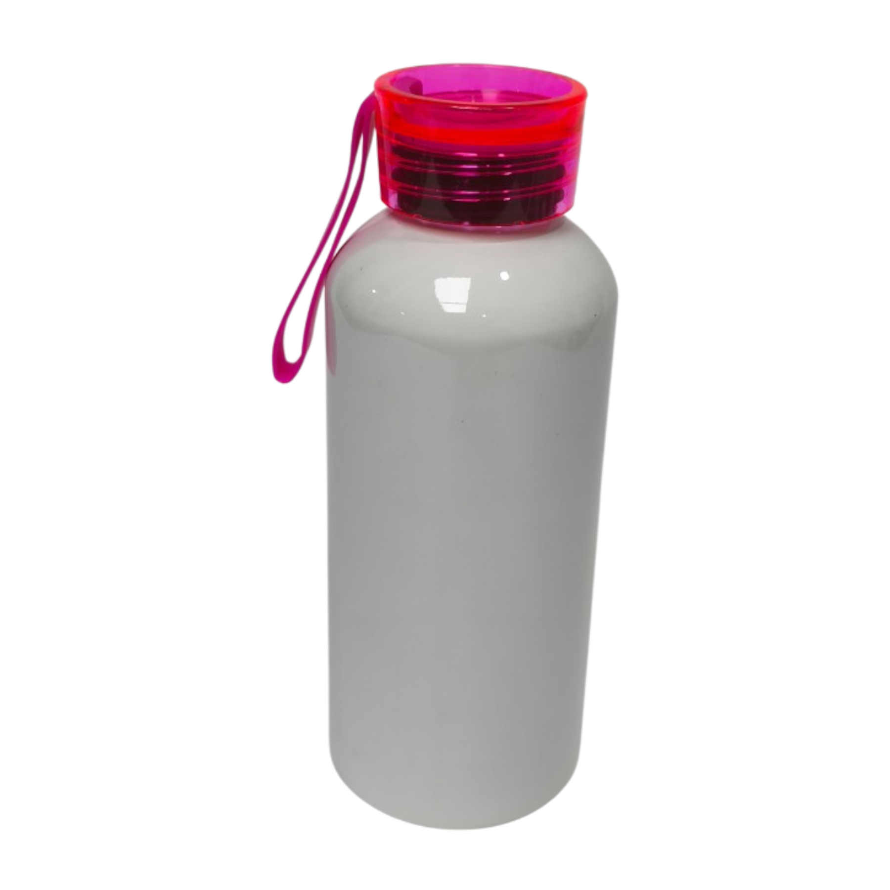 Bote sublimable de aluminio blanco con tapa rosada transparente y tira de silicon rosada.