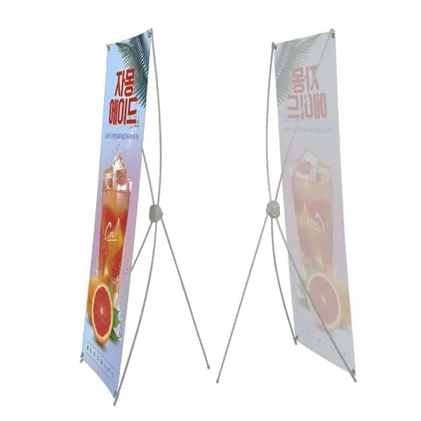 Display banner tipo X color plateado con varillas reforzadas.