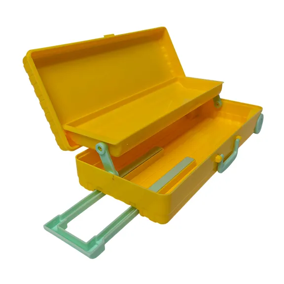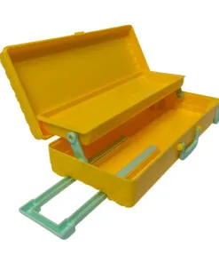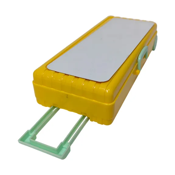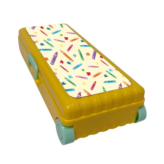 Estuche escolar para lapices en forma de maleta color amarillo.