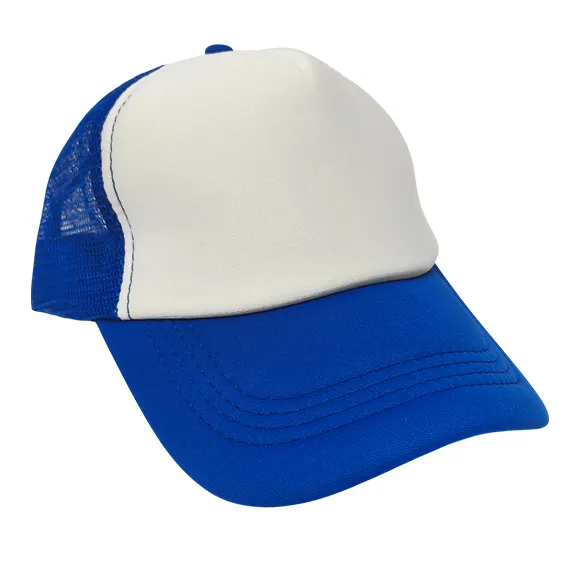 Gorra tipo camionero con malla color azul para sublimar.