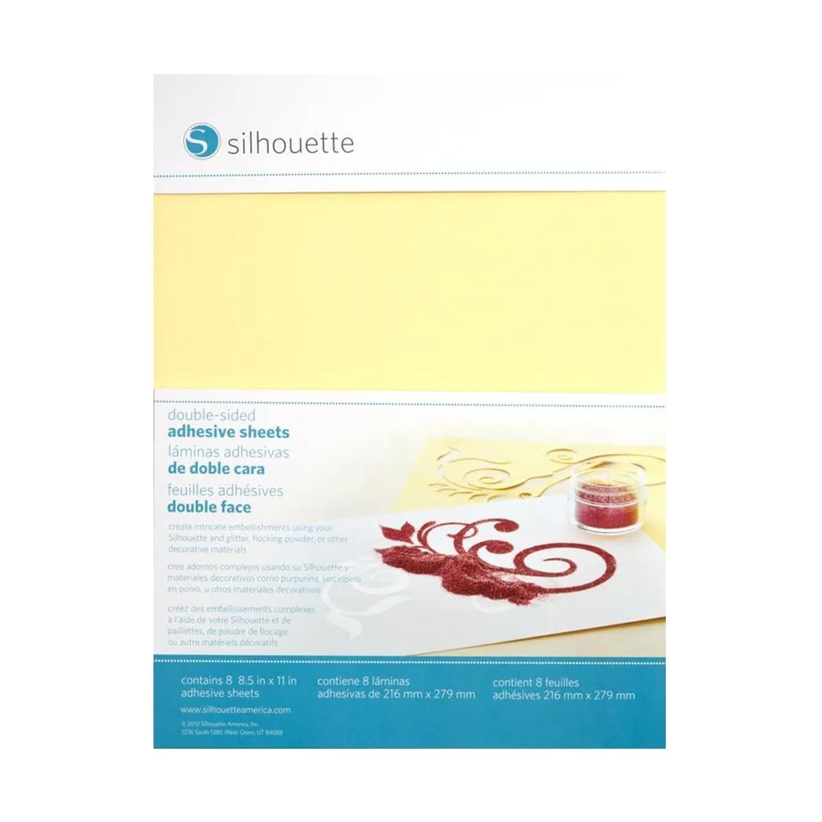 Use hojas adhesivas de doble cara con purpurina, polvo flocado, polvo para realzar u otros materiales decorativos para crear diseños intrincados con líneas asombrosamente nítidas. Simplemente corte un diseño, retire el revestimiento de respaldo y colóquelo en la superficie de su proyecto. Luego, retire el revestimiento de la superficie para exponer la superficie adhesiva. El respaldo mantiene el diseño recortado en su lugar y la superficie mantiene en su lugar cualquier material decorativo que se coloque sobre la superficie, como la brillantina.