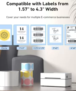 - La impresora de etiquetas de envío Munbyn tiene función automática de detección de tamaño y ajuste de etiquetas. Es compatible con etiquetas en tamaños de 1.57″ a 4.3″ de ancho, lo que garantiza suficiente diversidad para cubrir sus necesidades para múltiples negocios de comercio electrónico.