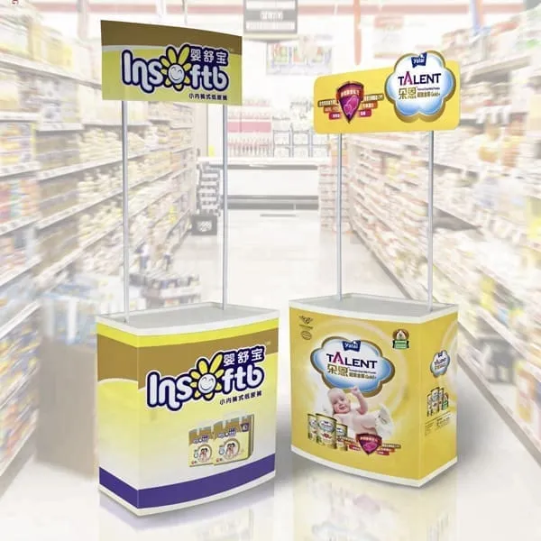 Mesa promocional con entrepaño, base y tablero de plástico y cenefa de PVC.
