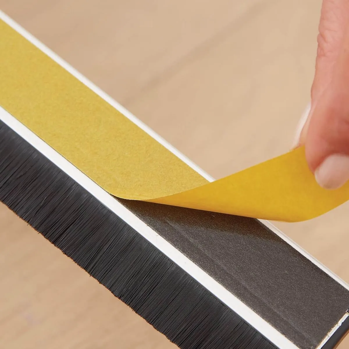 Si desea mantener el calor en el interior el cepillo bajo puertas para textiles de tesamoll® es la respuesta perfecta. Este burlete es un cepillo de puerta adhesivo especialmente diseñado para los cuartos con alfombras de pelo alto. Se fija fácilmente a la puerta sin la necesidad de taladrar agujeros. La placa de montaje de plástico puede cortarse para que se adapte a cualquier puerta. El cepillo con cerdas extra largas y elásticas de nailon sirve de cepillo de sellado perfecto capaz de cubrir huecos de hasta 15 mm de ancho entre la puerta y el suelo.