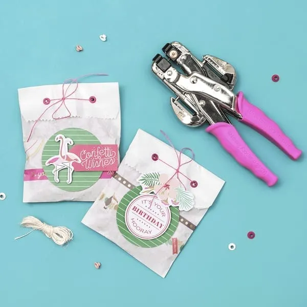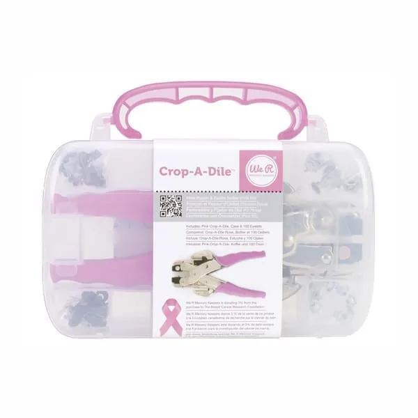El estuche tiene un compartimento central para colocar la herramienta de ojales recortable e incluye compartimentos para ojales, surtido de ojales de 100 piezas (veinticinco de cada uno de cuatro colores) y una hoja de instrucciones e ideas.
