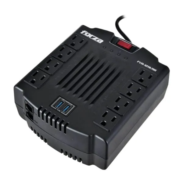 Aparte de ser un excelente estabilizador de tensión, el FVR corrige automáticamente las fluctuaciones repentinas de tensión y filtra el ruido eléctrico presente en la línea, a fin de mantener un suministro uniforme y “limpio” de energía. El FVR-1211USB de Forza es la solución perfecta para optimizar el desempeño de sus componentes y proteger su valiosa inversión.