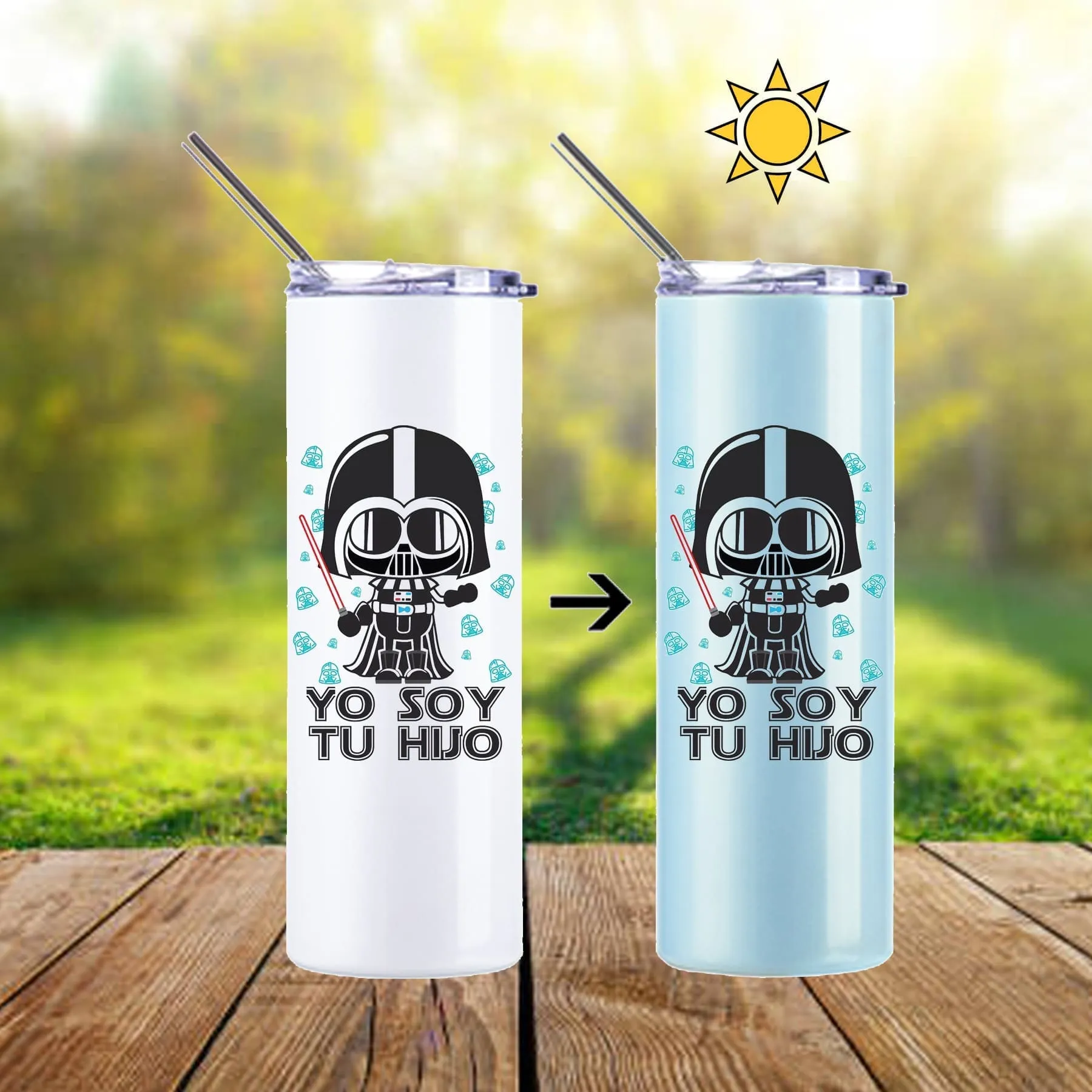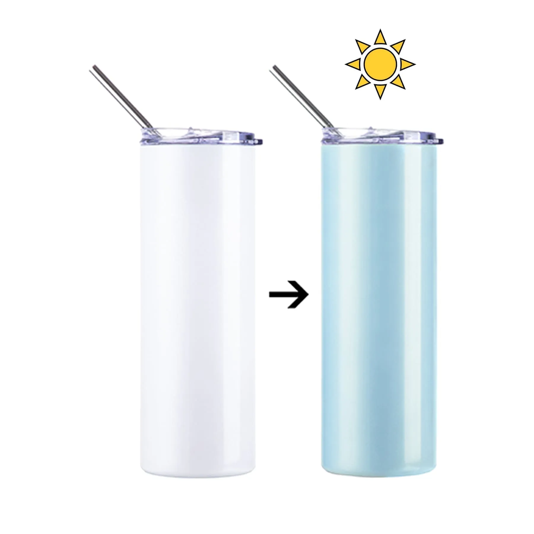 Tumbler para bebidas frías y calientes que cambia de color con los rayos del sol. Con pajilla de metal y tapa.