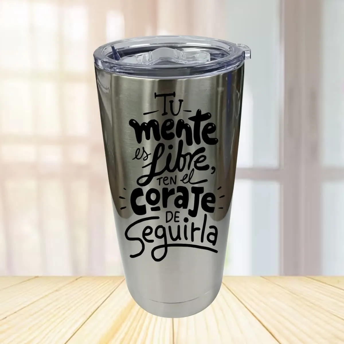 Tumbler de acero inoxidable color plateado. Ideal para personalizar.