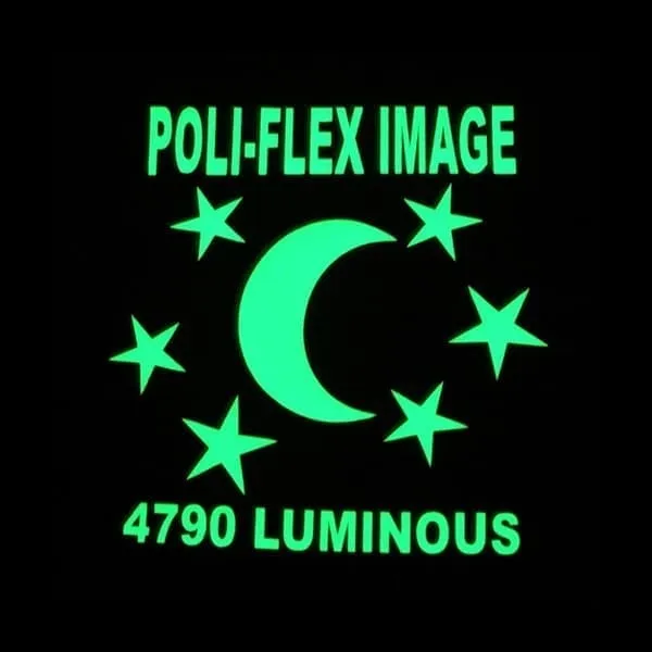 POLI-FLEX LUMINOUS es una película flexible luminiscente (brilla en la oscuridad) laminada con un adhesivo de activación térmica.