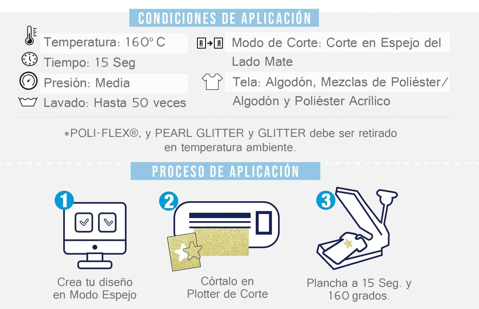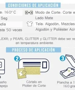 POLI-FLEX® PEARL GLITTER Y GLITTER es una película para transferencia térmica laminada con partículas de purpurina. Adecuado para transferir a textiles como algodón, poliéster, nylon sin recubrimiento, mezclas de poliéster / algodón y poliéster / acrílico.